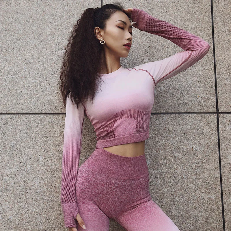 Special Offer Ombre Seamless 2 Piece Set Women Sport Suit Gym Workout Clothes Long Sleeve Fitness Crop Top And Scrunch Butt Leggings Yoga Set Discount 57% Today!