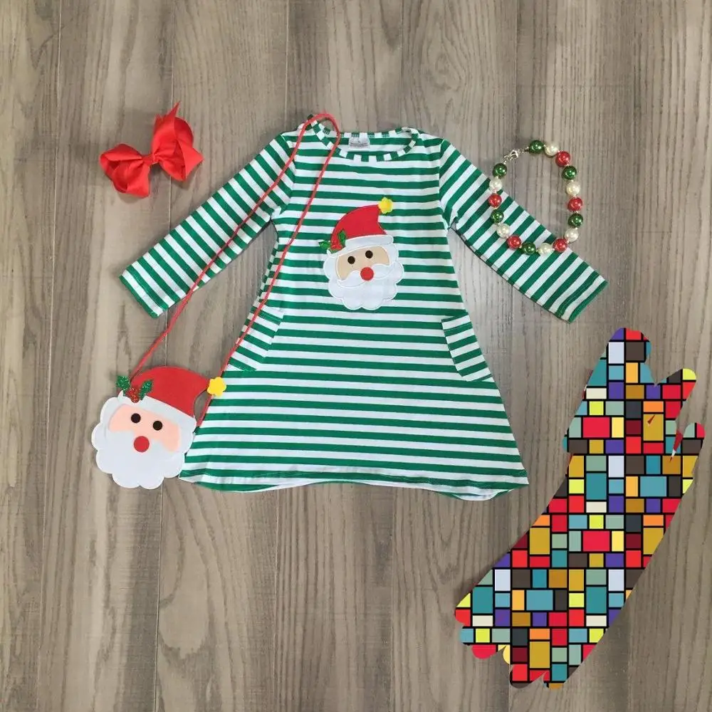Best . (0% Off) Buy baby girls christmas dress outfits girls green stripe dress with santa claus print girls dress with stocking purse and accessory Price Online.